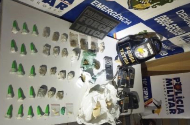 No local, foram apreendidos pinos de cocaína, porções de maconha e pasta base, rádios comunicadores, uma balança de precisão, um carregador e documentos pessoais.