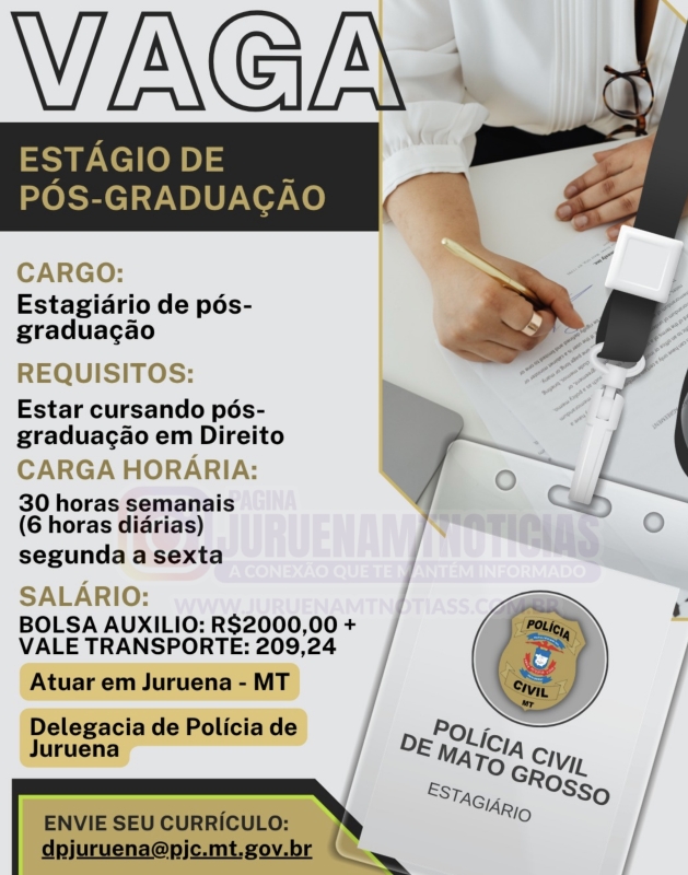 A Polícia Civil de Mato Grosso está com oportunidade aberta para estágio de pós-graduação na área de Direito, com atuação no município de Juruena.