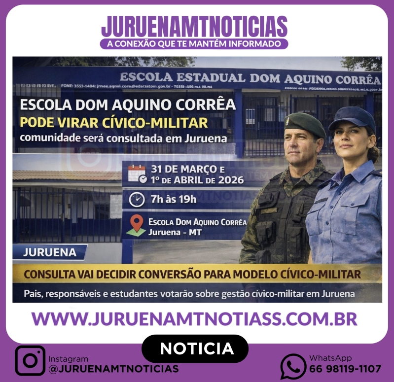 Pais, responsáveis e estudantes da Escola Estadual Dom Aquino Corrêa, em Juruena, serão consultados para decidir se a unidade escolar passará a adotar o modelo de gestão cívico-militar.